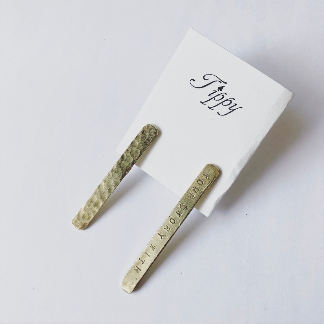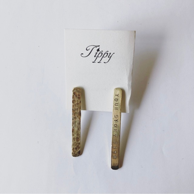 "YOUR STORY WITH " あなたの物語に 真鍮プレートに刻印が施されたピアス アシンメトリーになる長さと凹凸のデザインが、さり気なく見えるシンプルなデザイン size : 縦6cm.横0.5cm :縦5cm.横0.5cm