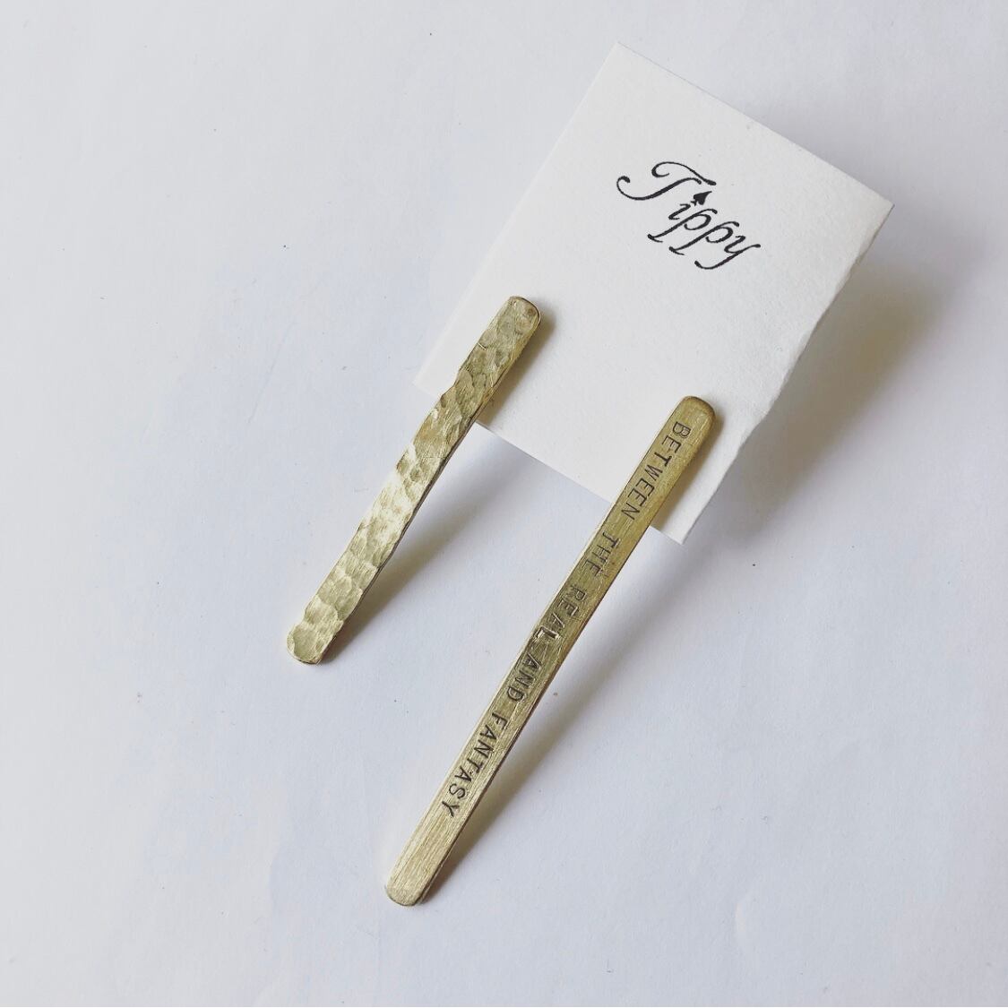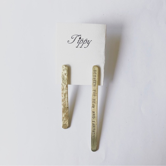 "BETWEEN THE REAL AND FANTASY " リアルとファンタジーの狭間 真鍮プレートに刻印が施されたピアス アシンメトリーになる長さと凹凸のデザインが、さり気なく見えるシンプルなデザイン size : 縦8cm.横0.5cm :縦6cm.横0.5cm