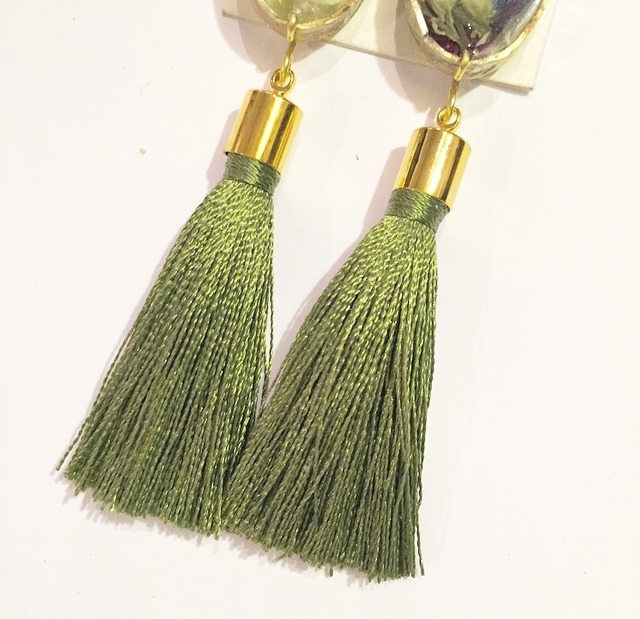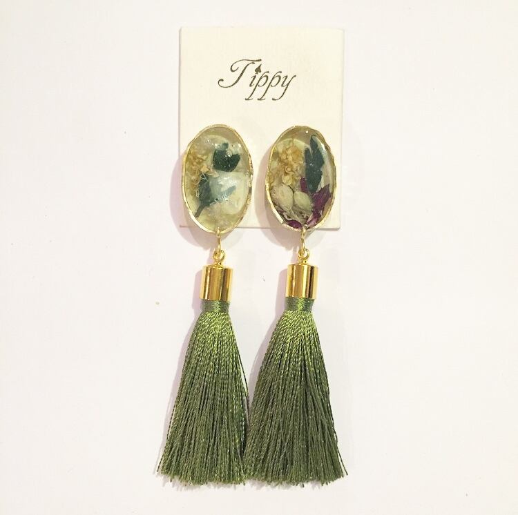 淡く儚い光を閉じ込めて… ドライフラワーを閉じ込めたオーバルモチーフに タッセルを組み合わせたピアス size : 縦9cm.横2cm ピアス / イヤリングのパーツ選択が可能ですので、備考欄にどちらをご希望か必ずご記入をお願い致します 記入が無かった場合はピアスの金具を付けての発送になりますので、ご了承くださいませ