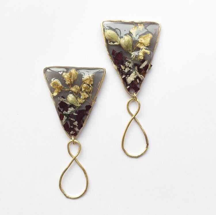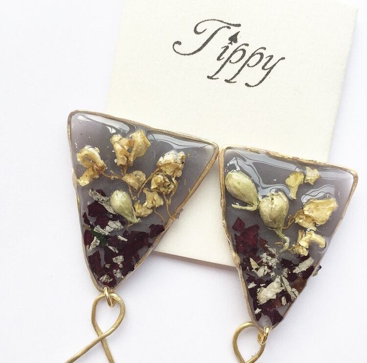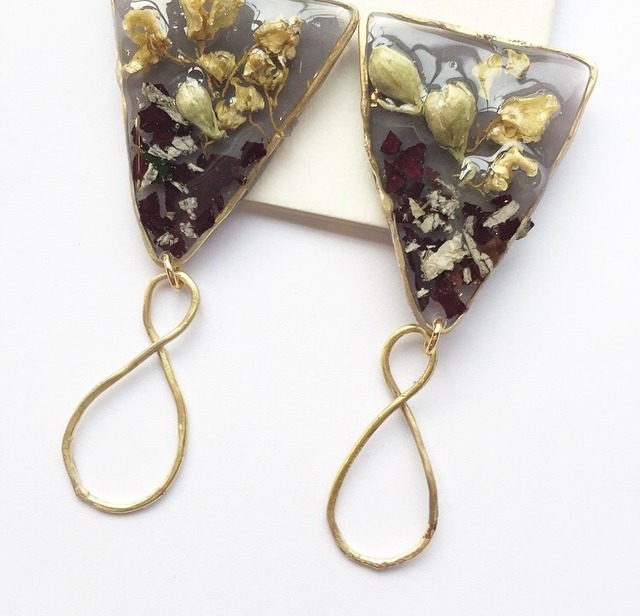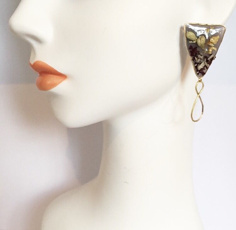 一つ一つ真鍮を溶接し創り出すデザイン 「淡く儚い光を閉じ込めて…」 Winter colorにペタルを閉じ込めたデザイン size : 縦7cm.横2.5cm ピアス / イヤリングのパーツ選択が可能ですので、備考欄にどちらをご希望か必ずご記入をお願い致します 記入が無かった場合はピアスの金具を付けての発送になりますので、ご了承くださいませ