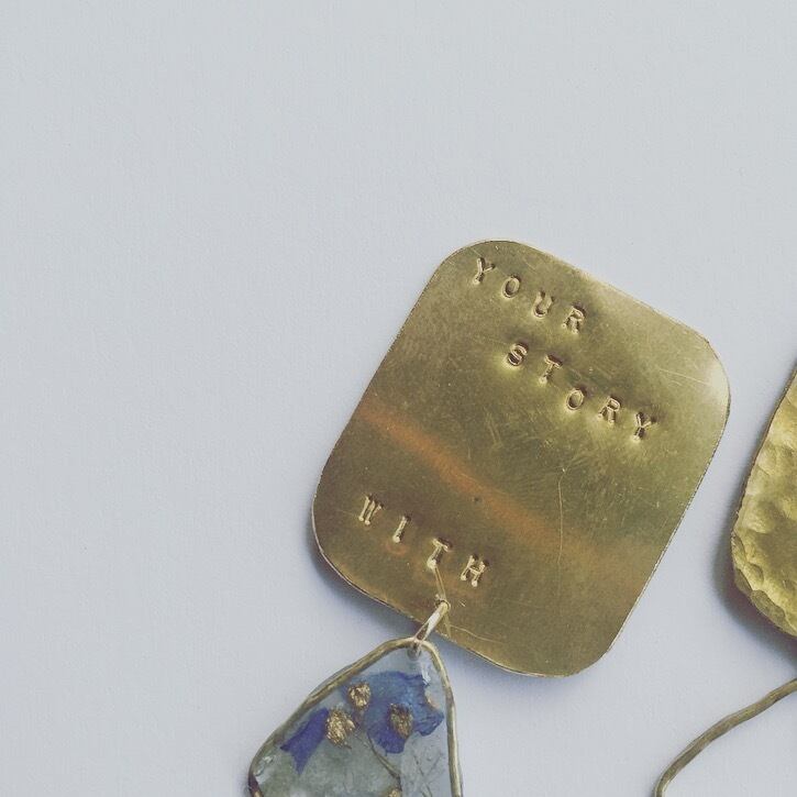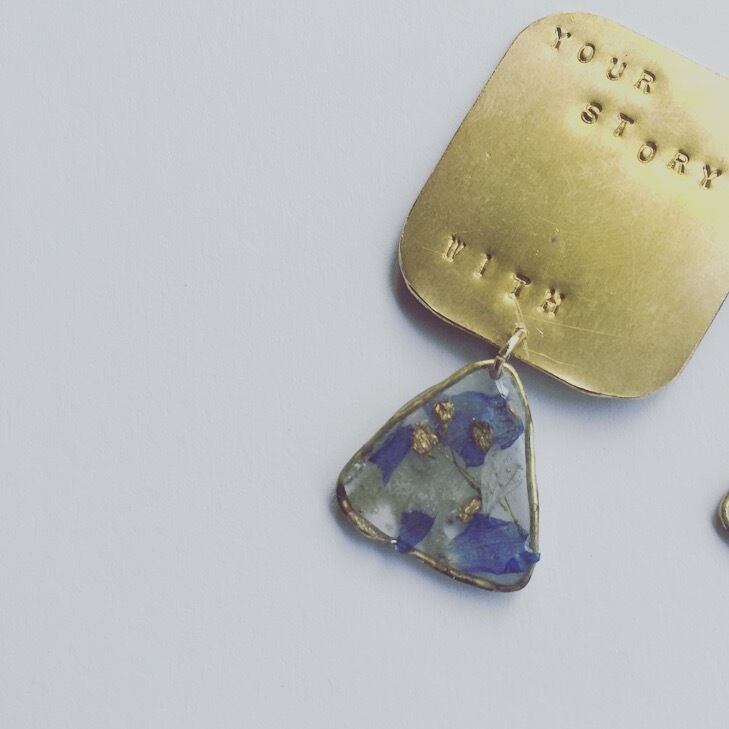 真鍮プレートに刻印your story with.(あなたの物語に…) 凹凸のプレートにはドライフラワーを閉じ込めてアシンメトリーのプレートアイテムになります 揺れるトライアングルが可愛いアクセサリー size : 縦5cm.横3cm イヤリング/ピアスの金具は付いておりませんので、ご希望の方は備考欄にコメント下さいませ