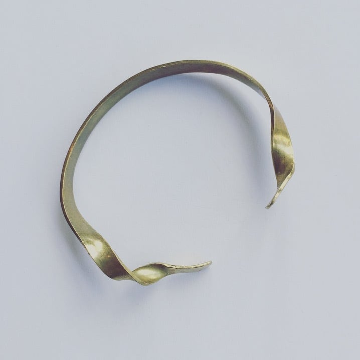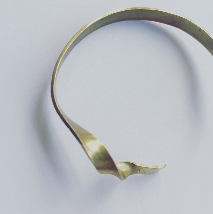 真鍮プレートをループ状にデザインしたバングル シンプルなアイテムになりますので、重ね付けにも組み合わせられるデザインバングルになります size : 幅0.5mm size : 調節可能なフリーサイズ