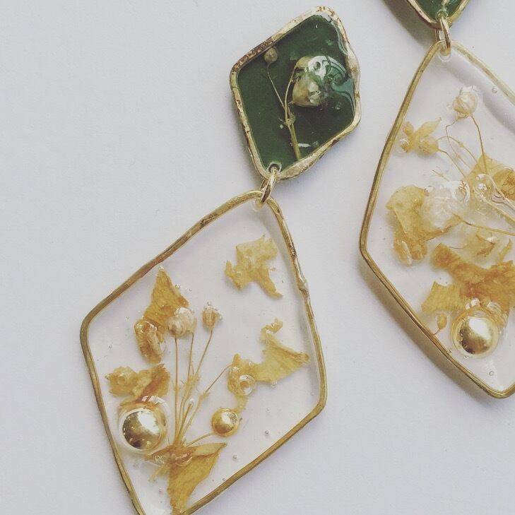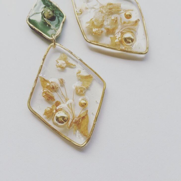 一つ一つ真鍮を溶接し創り出すデザイン 「淡く儚い光を閉じ込めて…」 オータムカラーにペタルを閉じ込めたデザイン ダイヤ型のデザインが揺れ動くアイテムです size : 縦6.5cm.横3cm イヤリング/ピアスの金具は付いておりませんので、ご希望の方は備考欄にコメント下さいませ