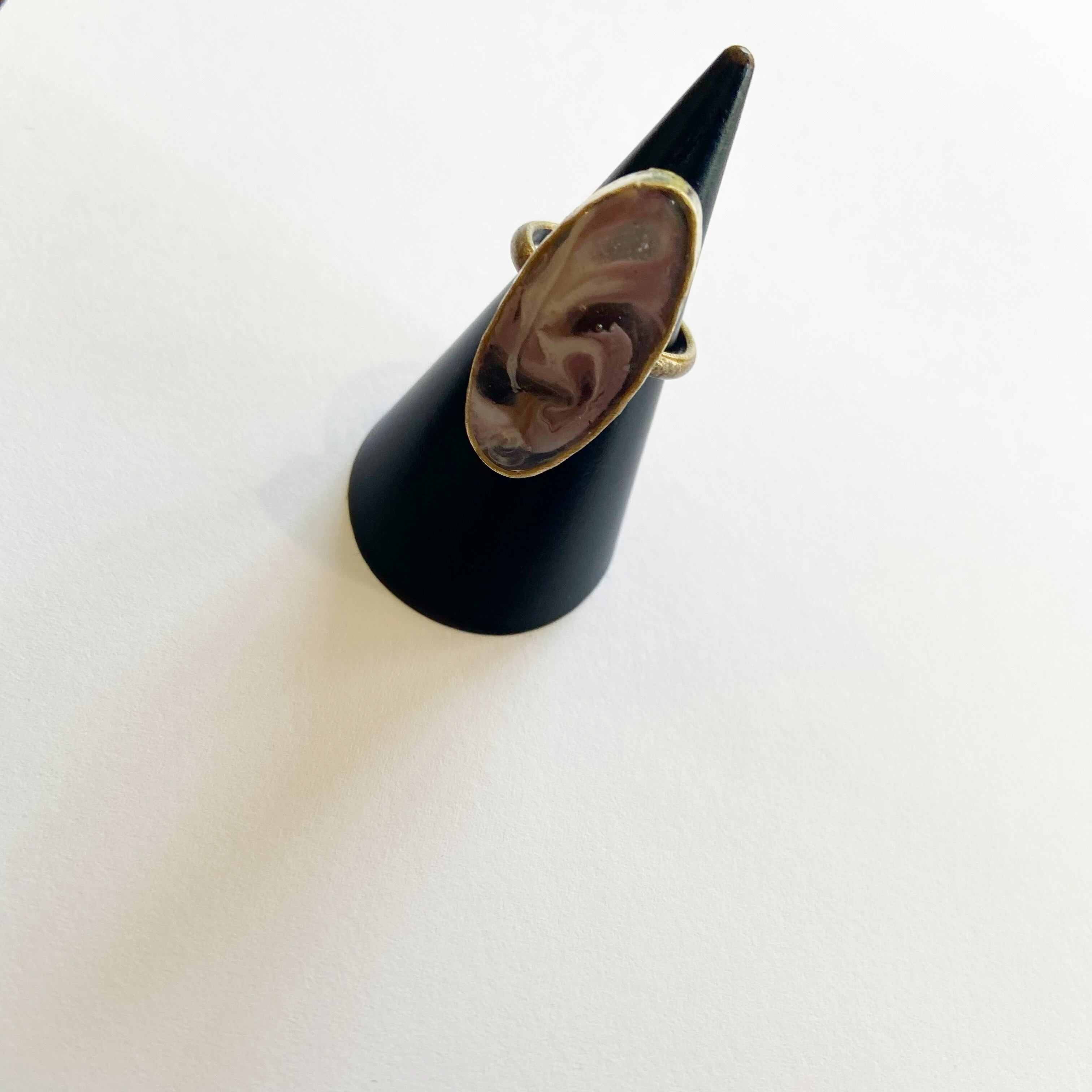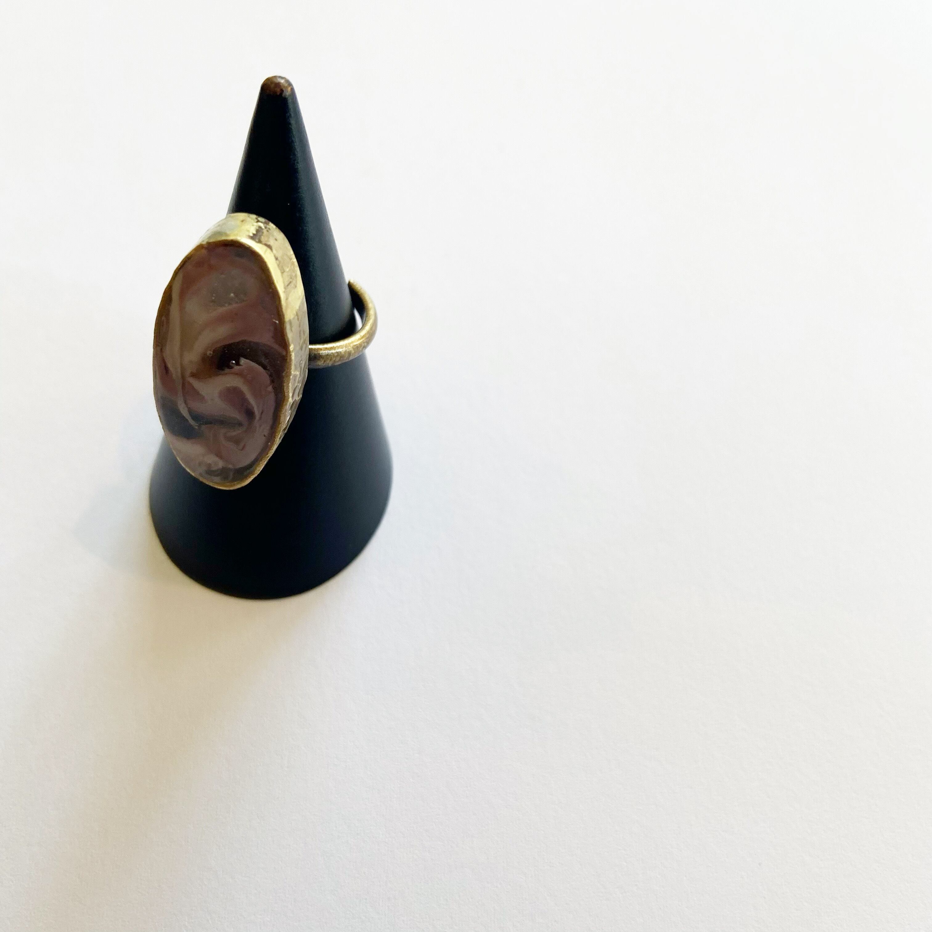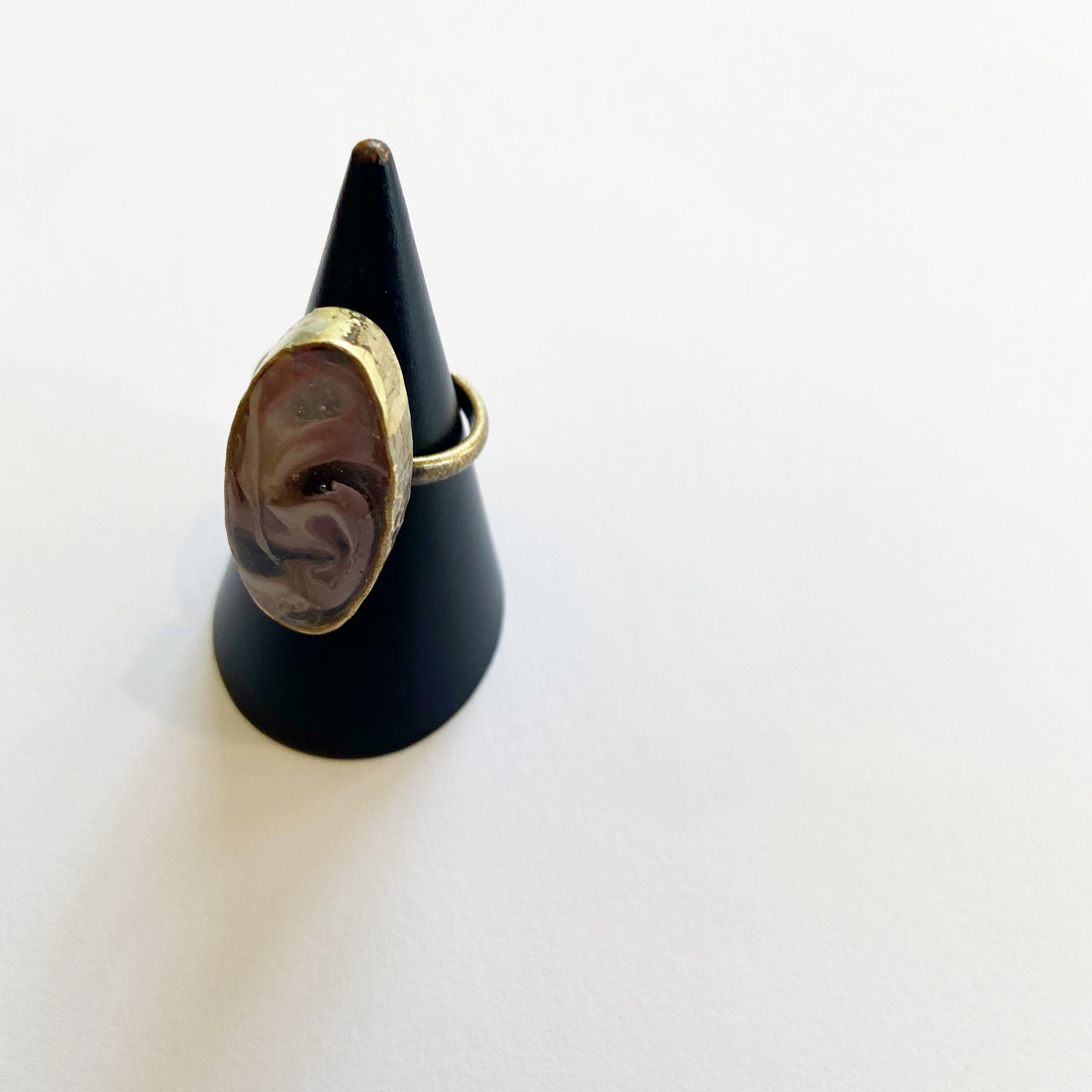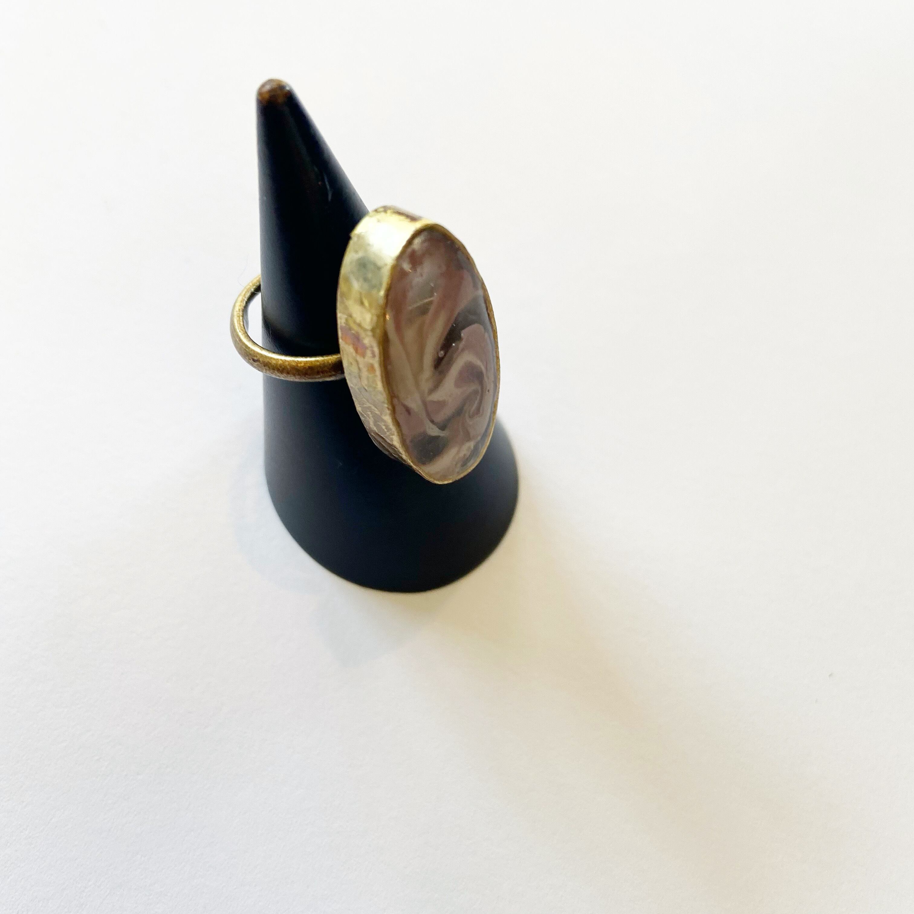 光を纏うカレイドスコープ(万華鏡)… 一つ一つ筆先で描くマーブルのカラーが魅力のアイテムです 光の加減で色味が変わり 重ね付けにもおすすめなデザインです 見える角度によって、マーブルのデザインが存在感を演出してくれるアクセサリーです size : オーバル 縦2.7cm.横1.2cm ring size : フリーサイズ