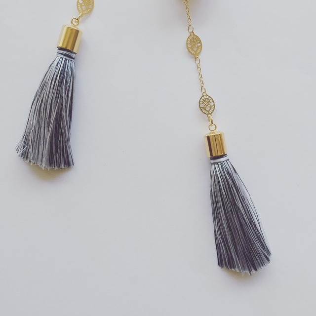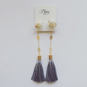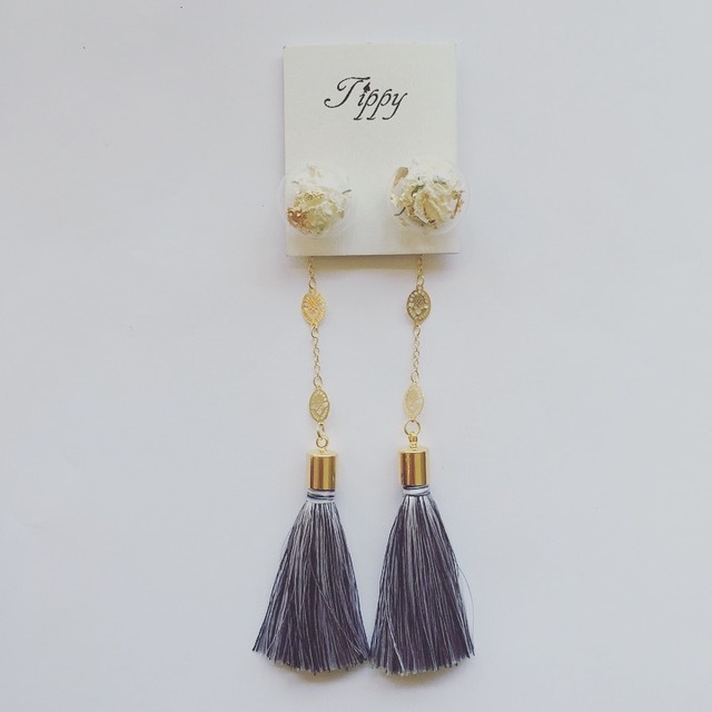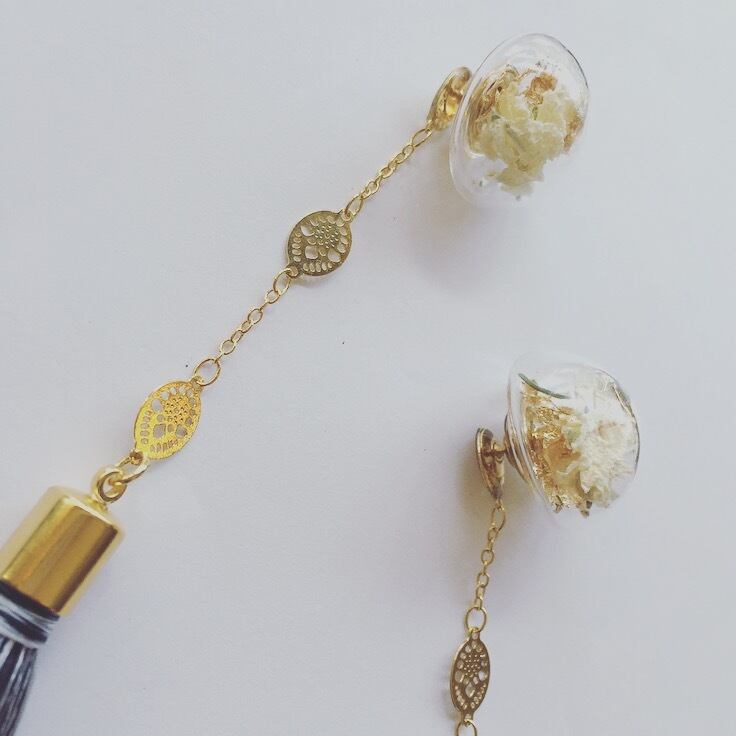 ドーム型のガラスにドライフラワーを詰め込んだアクセサリーになります ドライフラワーのコントラストと揺れるタッセルが可愛いアイテム こちらは2wayのアクセサリーになりますので、チェーンの方を表にする事もでき、その日の気分で組み合わせが楽しめるピアスです size : 縦12cm.横2cm