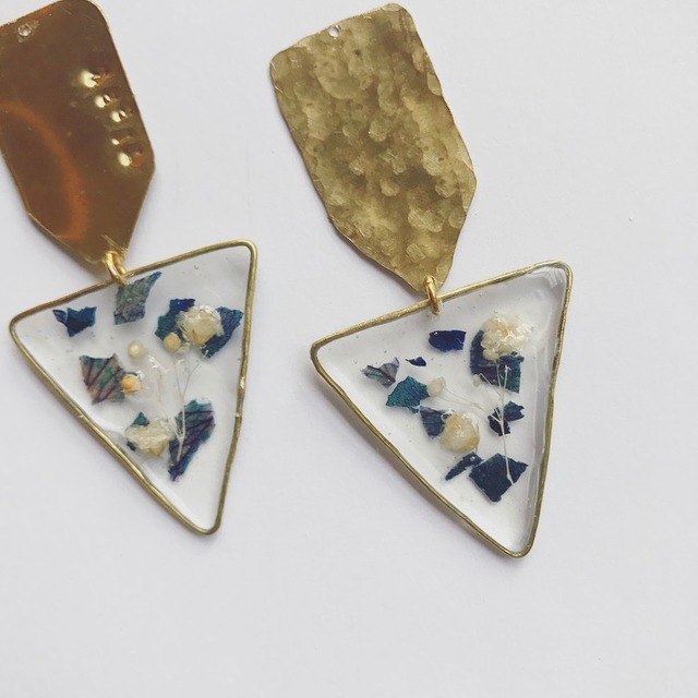 真鍮プレートに刻印を入れたアクセサリー 凹凸の枠の中には立体的なドライフラワーを閉じ込めてアシンメトリーのプレートアイテムになります 揺れる耳元が可愛いアクセサリー size : 縦7cm.横3cm ピアス/イヤリング交換可能 ご希望の方は備考欄にコメント下さいませ