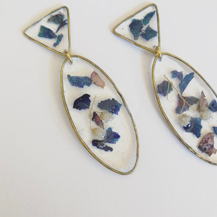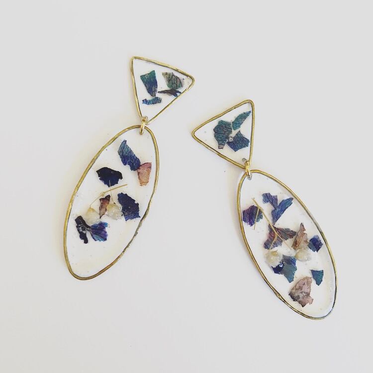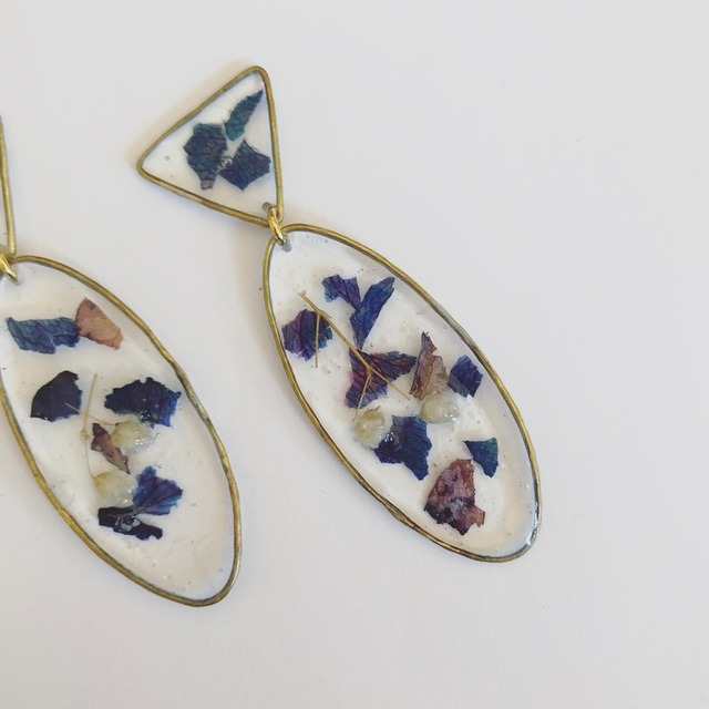 一つ一つ真鍮を溶接し創り出すデザイン 「淡く儚い光を閉じ込めて…」 ペールカラーにペタルを閉じ込めたデザイン トライアングル型のデザインが揺れ動くアイテムです size : 縦7cm.横2cm イヤリング/ピアスの金具は付いておりませんので、ご希望の方は備考欄にコメント下さいませ