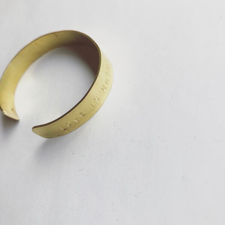 真鍮プレートをベースに、シンプルなデザインのバングル "LOVE IS DOING SMALL THINGS WITH GREAT LOVE" シンプルなアイテムになりますので、重ね付けにも組み合わせられるデザインバングルになります size : 幅1cm size : 調節可能なフリーサイズ