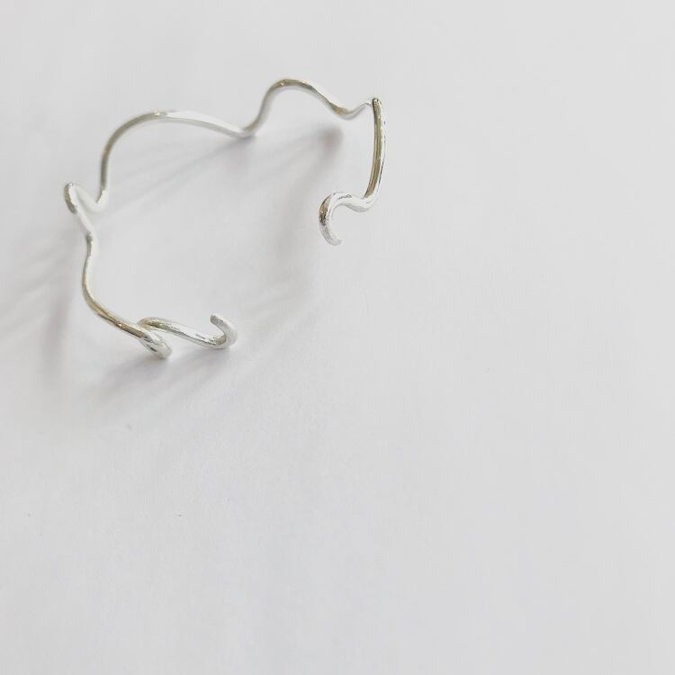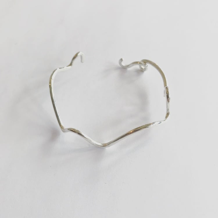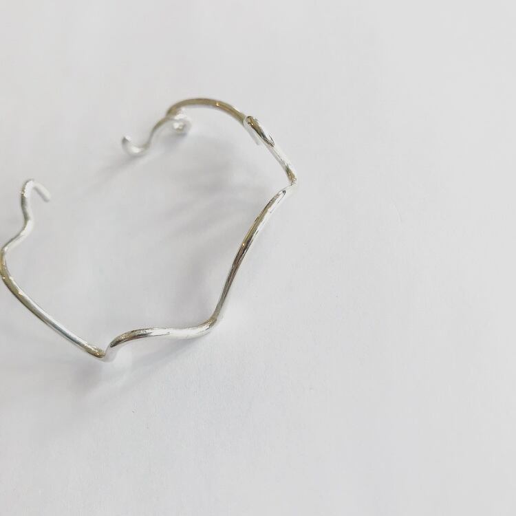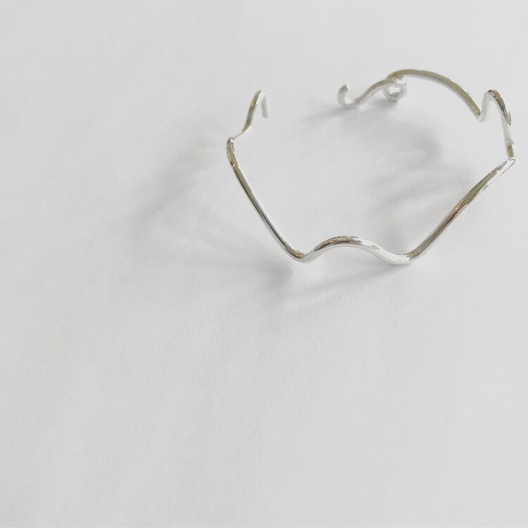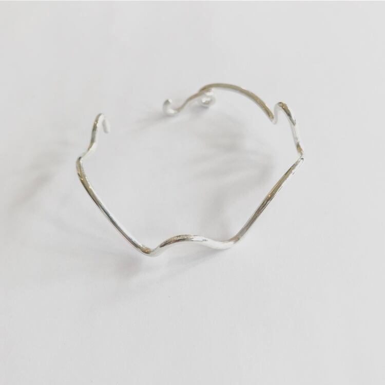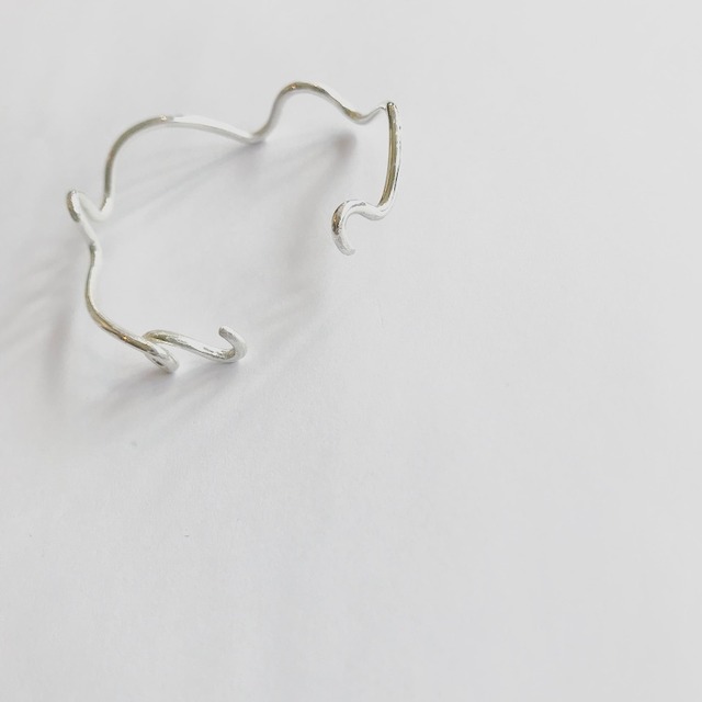 ウェーブのラインが立体的なシルバーバングル 手首に沿わせてバングルにもでき、フロント、バック、どちらを前にしてもデザインが際立つ、2wayで楽しめるアイテムになります silver 950を使用 size : 幅2mm size : 調節可能なフリーサイズ